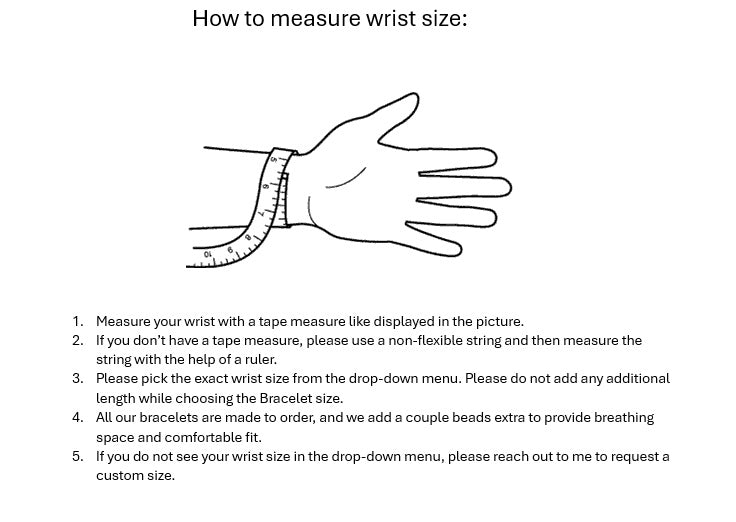 Please measure your wrist where you want the bracelet to fit the best. Measure using a non-stretchy string or a measuring tape. Then select the exact bracelet size to purchase. Our bracelets are made to order per size selected by you and include enough breathing space.