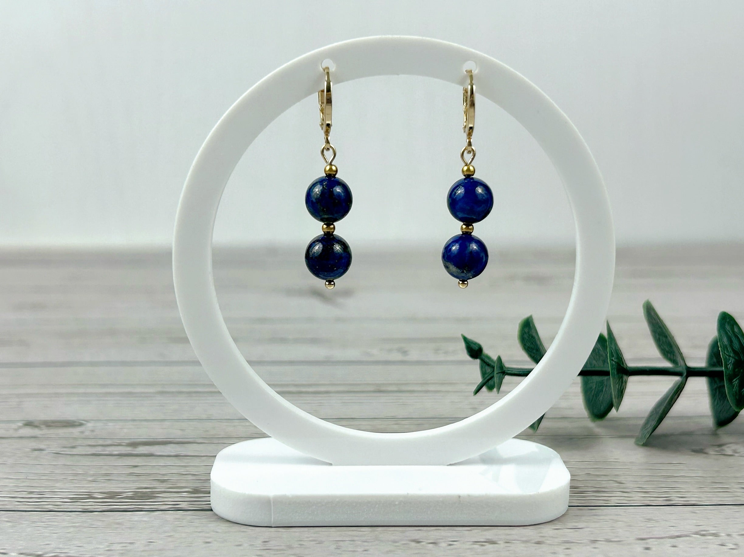 This beautiful pair of earrings is created using round Lapis Lazuli Gemstone beads with gold plated or silver plated stainless steel spacer Beads in lever back ear hooks